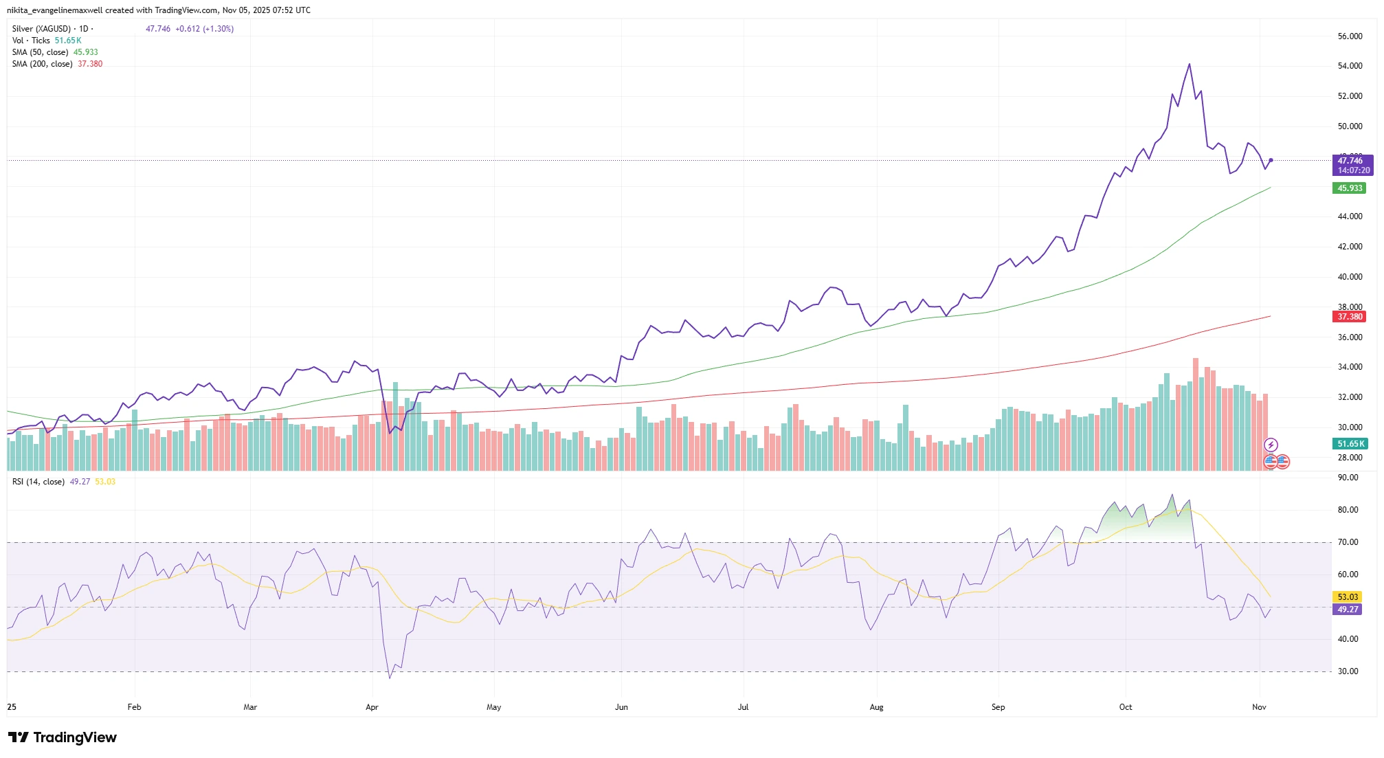 Silver’s daily chart shows a narrowing wedge pattern with RSI quietly rising, a classic sign that momentum may be coiling beneath the surface.
